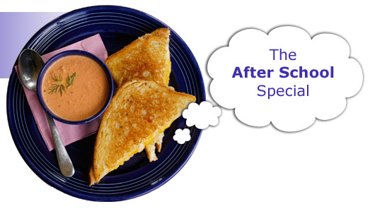 Cheddar and Swiss Cheeses grilled to melting on our tangy sliced Sourdough adorned with delicate Dill Butter. Dip the sandwich in the accompanying *Creamy Dreamy Tomato Soup. Genius! Let the dog eat your homework!